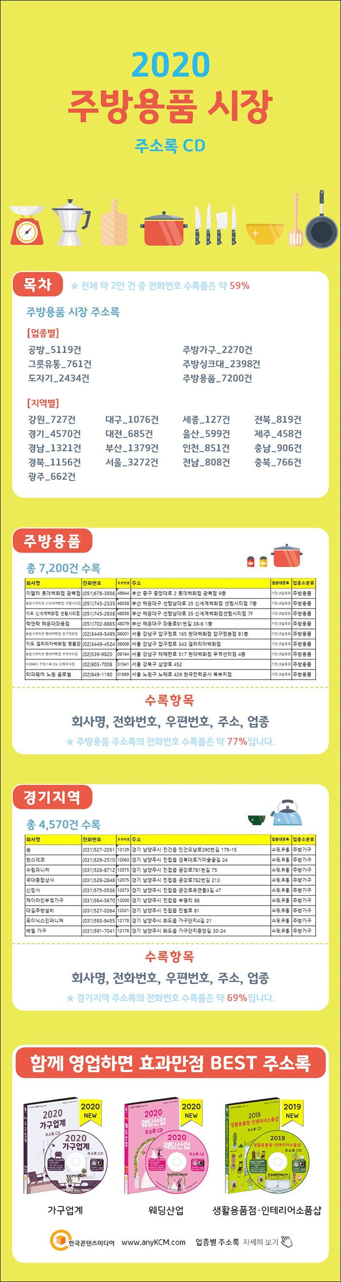 <2020 주방용품 시장 주소록 CD>에는 그릇유통, 주방가구, 주방싱크대, 주방용품, 공방, 도자기 주소록 약 2만 건을 수록했다. 본 CD롬은 엑셀(xls) 형태로 수록되어 있어 사용자가 편리하게 수정·편집·출력할 수 있다.