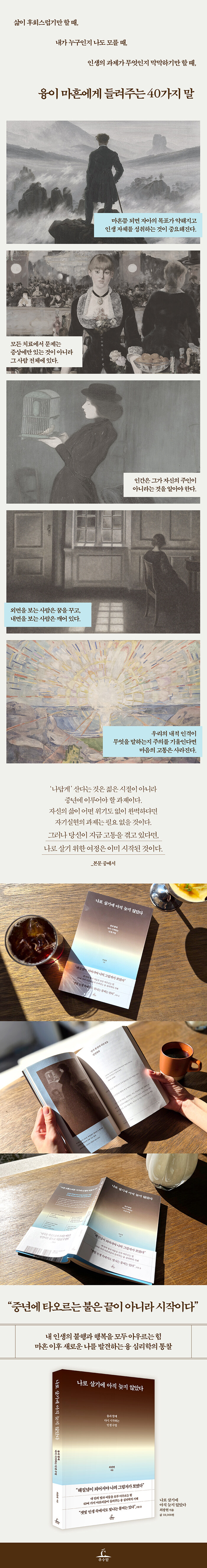 나는 중년이 본격적으로 시작되는 마흔 이후로는 변화가 선택이 아닌 필수이자 생존 그 자체라고 말하고 싶다. 언뜻 보기에는 중년의 위기가 경제적・사회적인 위치의 변화와 맞물려 일어난 문제로 보인다. 그러나 이러한 환경적 요인보다 근본적인 문제가 있다. 바로 자기 내면에서 올라오는 문제이다. 그동안 자신이 가족과 학교, 직장 등 외부 세계와 어떤 관계를 맺어왔는지, 내면세계는 어떻게 관리되었는지 돌이켜보는 작업이 필요하다. 이는 자신 안에서 일어날 변화를 준비하기 위해 반드시 이루어야 할 작업이다.