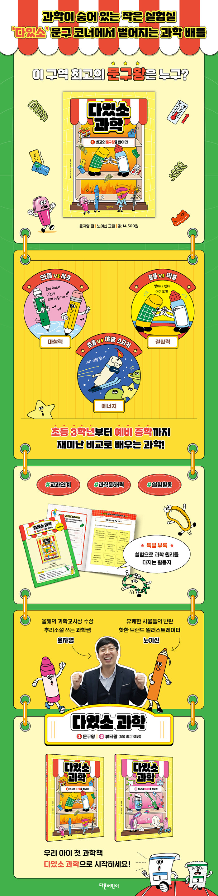 《다있소 과학》 시리즈는 문구 편을 시작으로 뷰티 편까지 이어지는 생활 밀착형 과학 교양 시리즈로, 과학을 낯설게 느끼는 아이들에게 가장 친근한 첫걸음을 선물할 것입니다.