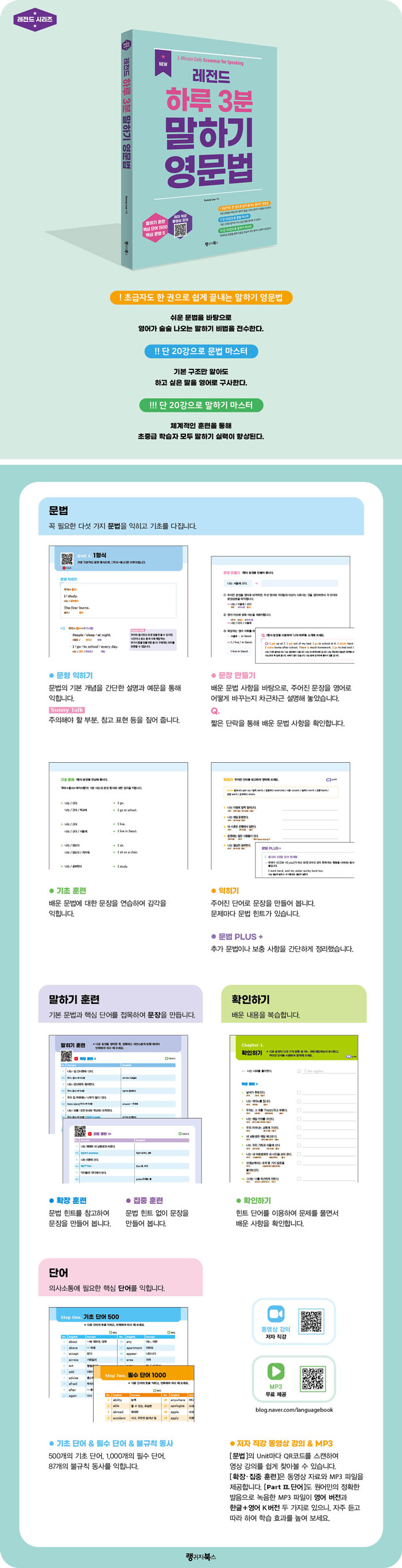 · 제목 : NEW 레전드 하루 3분 말하기 영문법 (초급자도 한 권으로 쉽게 끝내는 말하기 영문법, 20강으로 문법 & 말하기 마스터)