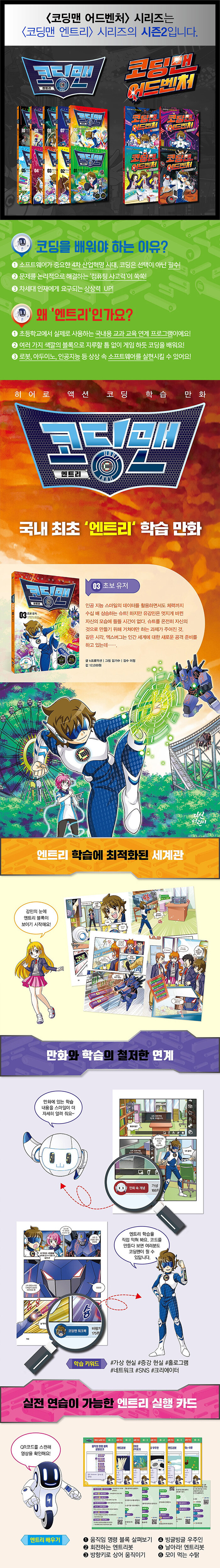 국내 최초 '엔트리' 학습 만화. 코딩이 능력이 되는 세계에서 성장해 나가는 주인공과 주변 캐릭터들 사이에서 벌어지는 다채로운 이야기를 통해 코딩에 대한 매력에 빠질 수 있다. 권말 '만화 속 개념'을 통하여 재미있게 읽었던 내용을 개념과 연계하여 기억할 수 있다.