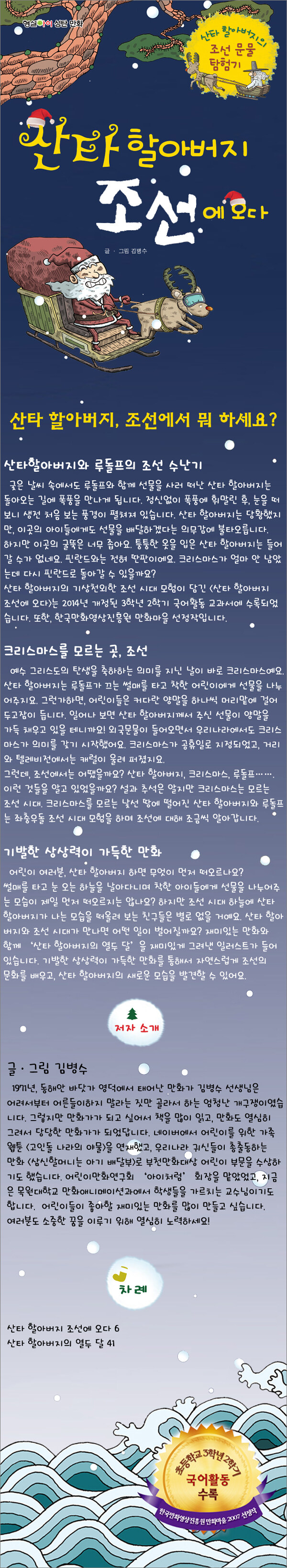산타 할아버지의 기상천외한 조선 시대 모험이 담긴 <산타 할아버지 조선에 오다>는 2014년 개정된 3학년 2학기 국어활동 교과서에 수록되었다. 또한, 한국만화영상진흥원 만화마을 선정작이다.
