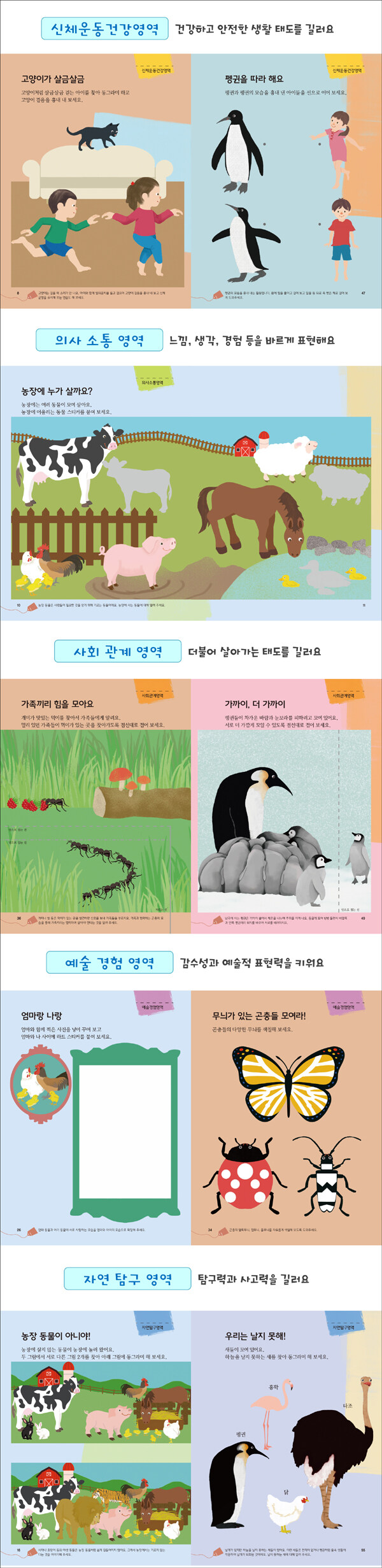 유치원 누리 과정과 어린이집 표준 보육 과정을 모두 담아 주제별 학습과 통합적 학습이 동시에 이루어진다. 모든 주제를 신체운동건강, 의사소통, 사회관계, 예술경험, 자연탐구 5개 영역의 재미있는 놀이로 활동하여 문제를 다각도로 접근하고 해결해 나가는 통합적 사고력을 키워 준다.