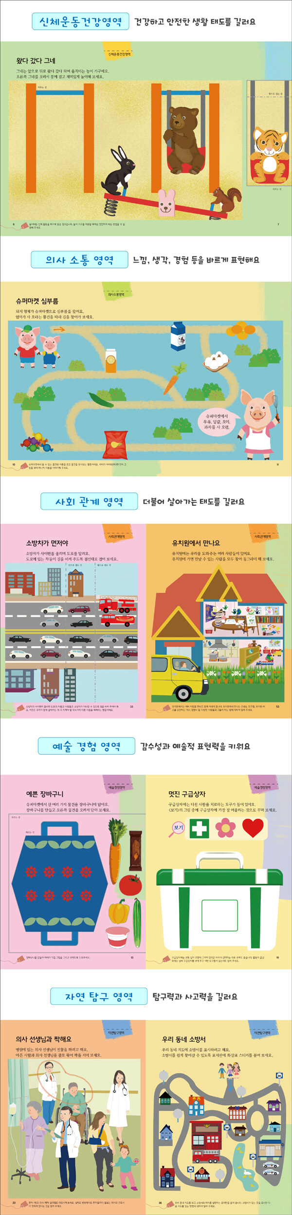 유치원 누리 과정과 어린이집 표준 보육 과정을 모두 담아 주제별 학습과 통합적 학습이 동시에 이루어진다. 모든 주제를 신체운동건강, 의사소통, 사회관계, 예술경험, 자연탐구 5개 영역의 재미있는 놀이로 활동하여 문제를 다각도로 접근하고 해결해 나가는 통합적 사고력을 키워 줄 것이다.