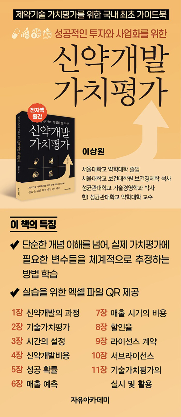 신약개발에 대한 투자와 협력이 증가하면서, 신약개발 프로젝트의 사업가치를 평가하는 신약개발 가치평가의 수요는 더욱 커지고 있다. 그동안 축적된 정보와 지식, 그리고 강의와 기업 자문에서 자주 등장하였던 질문들을 바탕으로 체계적인 학습이 가능하도록 내용을 구성한 교재다.
