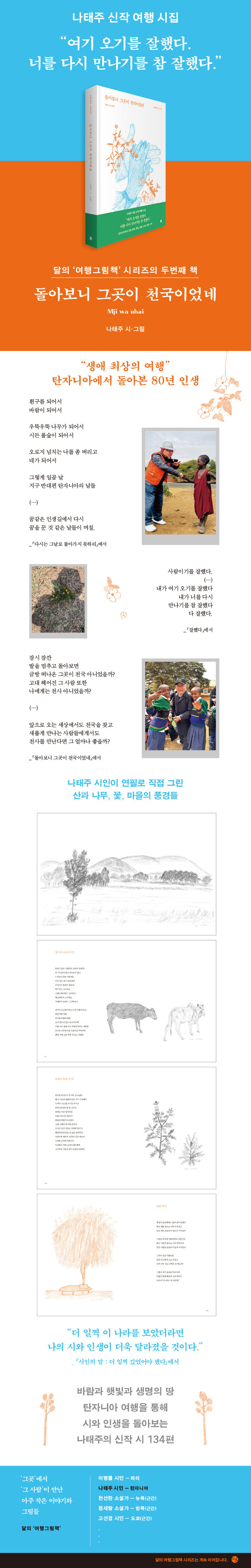 『돌아보니 그곳이 천국이었네』는 80세를 맞은 시인이 “생애 최상의 여행”이었던 탄자니아 여행을 통해 시와 인생을 돌아보며 읊조리는 신작 시 134편을 묶은 시집이다. 1부 ‘탄자니아의 시’에서는 여든의 시인이 꼬박 21시간을 달려가 6년간 후원해온 소녀를 만나는 여정을 담고 있다. “사진으로만 보았던” “눈이 크고 맑”은 여덟 살 아이는 어느새 “건강하고 씩씩한” 열다섯 소녀로 자라 있었고, “붉은빛 고운 먼지 흙바람”을 가득 채운 탄자니아에서의 시간들은 끝내 시인에게 “더 일찍 갔었더라면 좋았을” 인생의 전환점이 되어주었다.
