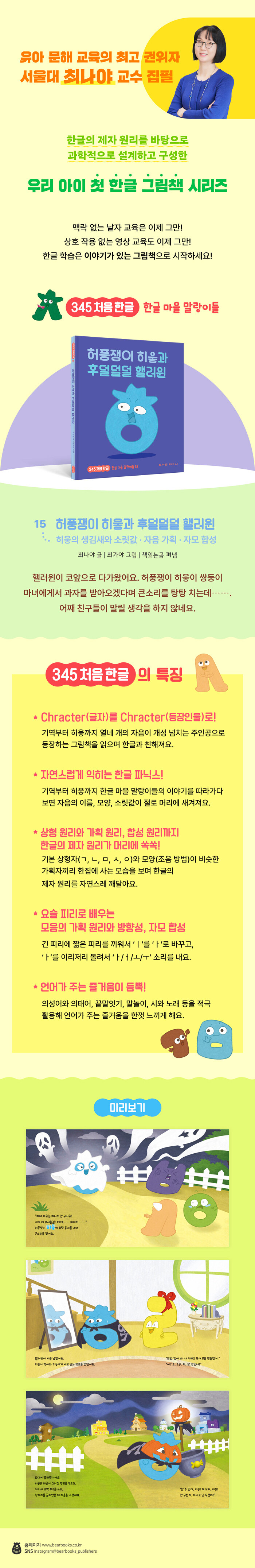 유아 문해 교육의 최고 권위자 서울대학교 아동가족학과 최나야 교수가 오랜 연구와 현장 경험을 바탕으로 기획하고 집필한 3~5세 첫 한글 그림책 시리즈 아홉 번째 책. 비읍이 둘(쌍비읍)이 되는 에피소드를 통해 자음 합성의 원리를 배울 수 있다.