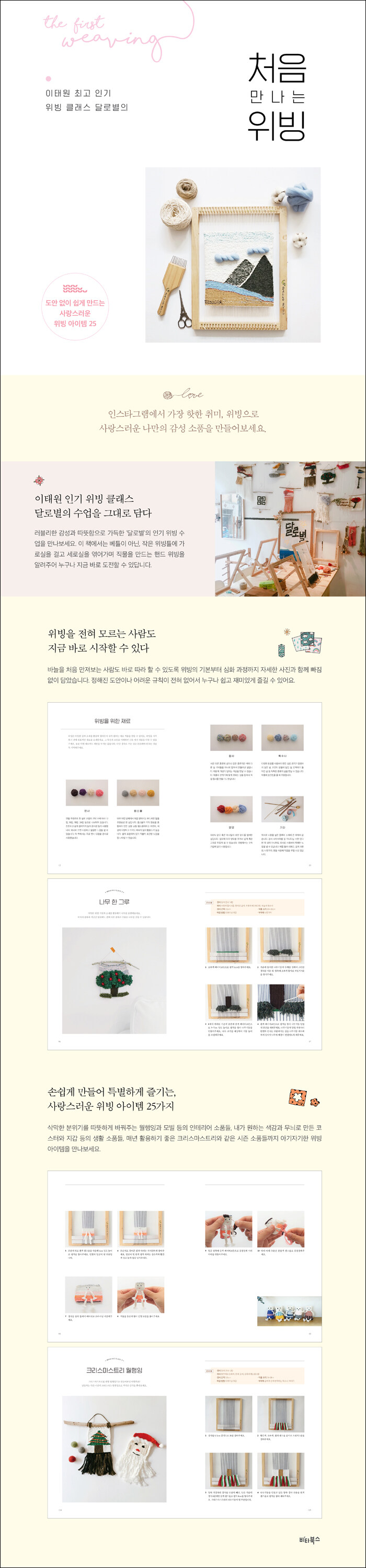 최근 인스타그램에서 가장 핫한 취미 중에 하나인 위빙을 이태원 최고의 인기 클래스를 운영하고 있는 저자가 쉽고 간편하게 따라 할 수 있도록 알려준다. 위빙은 다양한 소재의 실과 실, 또는 실과 오브제를 가로세로로 엮어서 직물을 만드는 작업이다.