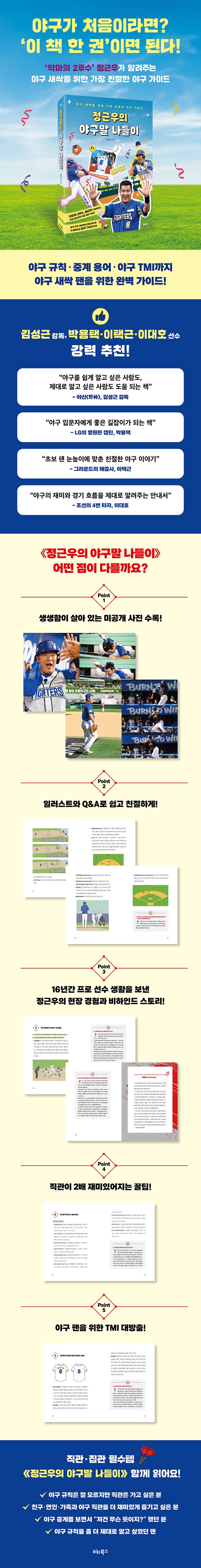 프로 야구 선수로서 오랜 시간을 현장에서 보낸 정근우의 경험은 이 책에 현실감을 더한다. 야구는 단순한 경기 규칙의 집합이 아니라, 흐름과 분위기, 사람들이 팀을 이뤄 만들어가는 이야기라는 점을 자연스럽게 전하며, 독자가 야구를 즐기면서 이해할 수 있도록 안내한다.