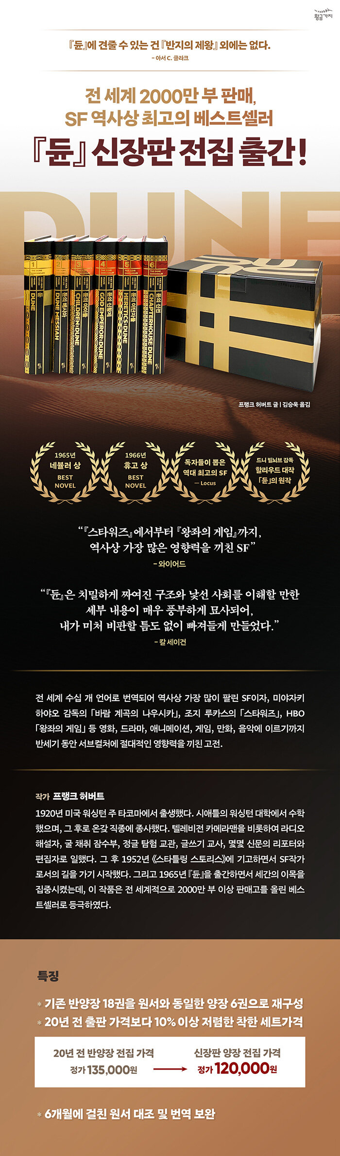 역사상 가장 많이 팔린 SF이자 독자들이 뽑은 역대 최고의 SF인 프랭크 허버트의 대작 『듄』이 신장판 전집으로 출간되었다. 2001년 첫 번역본이 출간된 이후 20년 만에 재출간된 신장판은, 기존의 18권 반양장본을 원서와 동일한 6권으로 묶은 양장본이다.