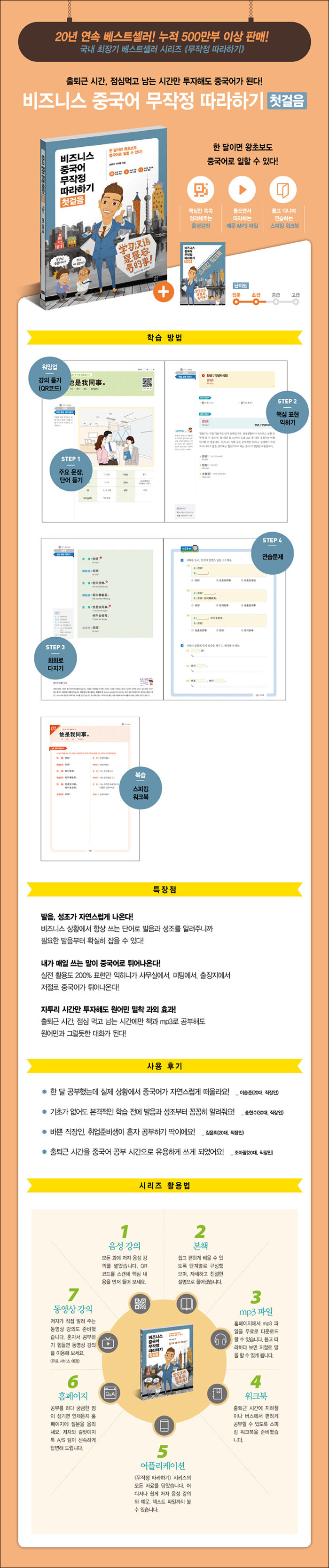중국어를 처음 시작하는 직장인, 취업준비생을 위한 교재. 주인공의 스토리를 따라 하루에 핵심문형 3개만 배우고, 회화문과 연습문제로 배운 내용을 정리한다. 공부할 시간이 부족한 직장인을 위해 발음과 성조를 익히는 파트를 포함해 한 달 만에 초급 수준의 중국어 회화를 끝낼 수 있도록 구성했다.