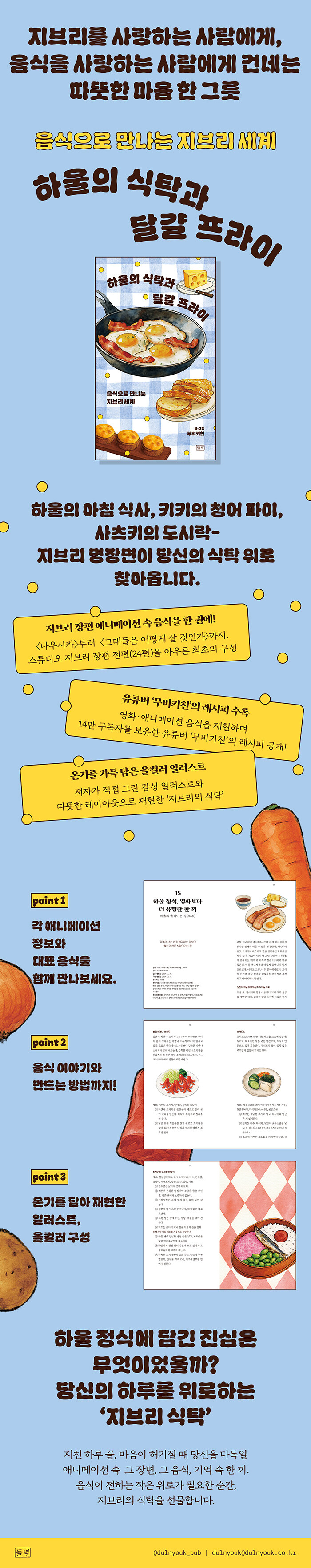 누군가에겐 애니메이션이, 누군가에겐 음식이 먼저 다가올 수 있겠다. 하지만 이 책을 덮을 때쯤엔, 그 두 세계가 맞닿은 자리에 ‘이야기’라는 온기가 남아 있기를 바란다. 지브리를 사랑하는 사람도, 요리를 사랑하는 사람도 잠시나마 나와 같은 자리에 앉아 온전히 충만해지길…!