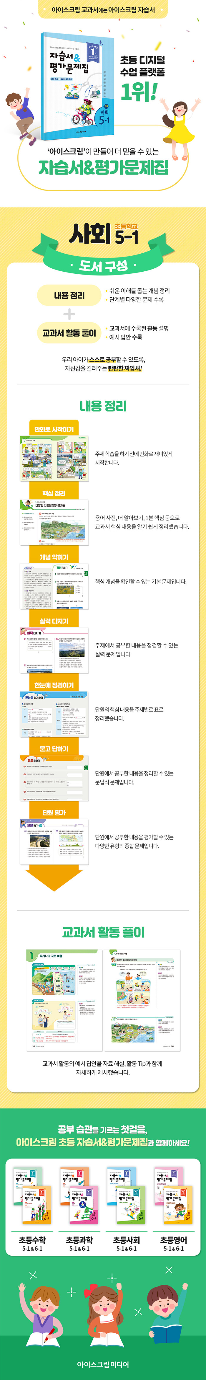 진도에 따라 스스로 학습하는『초등학교 사회 5-1 자습서&평가문제집』은 교과서를 반영한 완전 학습서로 학생들이 기초 개념을 이해하고 공부할 수 있도록 단계별 콘텐츠를 수록했다. 아이들이 교과서를 좀 더 정확하게 이해하고, 개념을 탄탄하게 익힐 수 있도록 알기 쉬운 설명과 단계별 평가 문제를 제공한다.