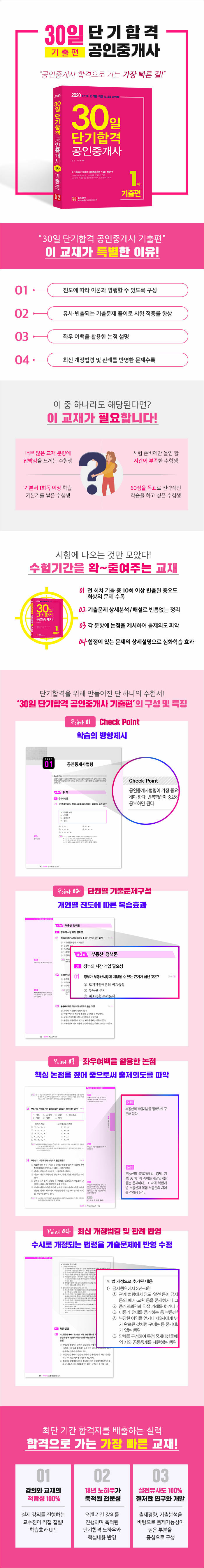 2020 30일 단기합격 공인중개사 1차 이론편은 60점 합격에 꼭 필요한, 출제가능성 높은 부분만으로 구성하여 2020년 최단기 합격을 위한 단기합격 시리즈이다.