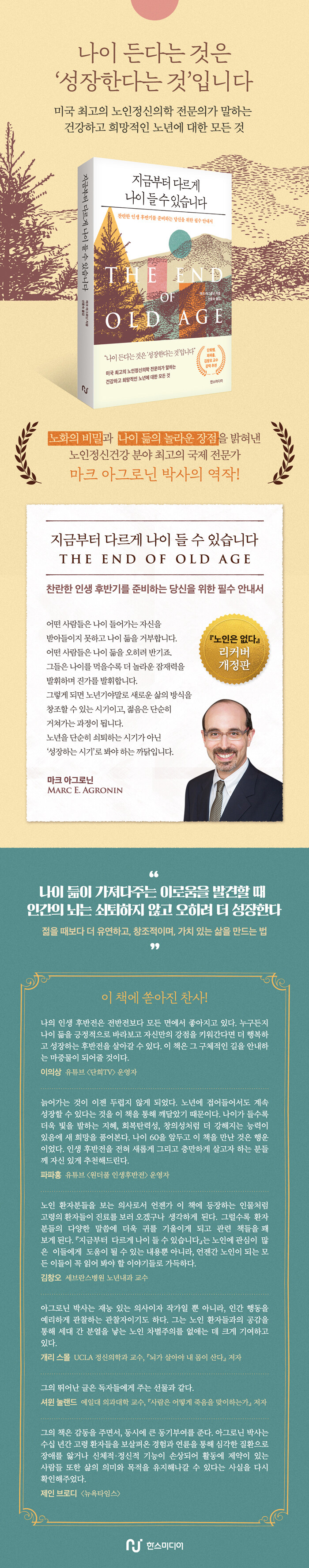 ‘우리는 왜 나이 들어야 하는가’라는 질문에 대한 답을 찾기 위해서는 나이 듦의 이로움을 잔뜩 가리는 구름을 치워야 했다. 물론 이 사실을 모든 사람에게 납득시키기는 힘들다. 특정 시점 이후로는 나이 드는 데 따른 장점은 전혀 없다고 믿는 사람이 여전히 있을 테니 말이다. 다만 두려운 것은 노년의 삶을 잘 유지하고 풍요롭게 하는 문제에 완전히 무관심하다 보면, 행복하고, 편안하고, 독립적인 능력이 있을 때에만 삶이 의미 있다는 결론을 내리게 된다.