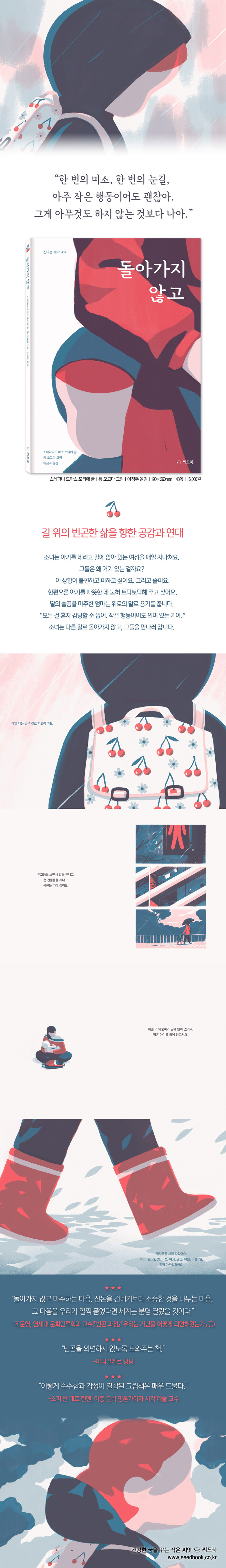 담담한 글과 여백을 활용한 시적인 그림으로 마음에 긴 여운을 남기는 그림책이다. 길 위에 사는 가난한 이웃을 어떻게 바라보고 대할 것인가, 불평등한 일상에서 우리가 취할 자세에 관하여 아이의 시선으로 고민과 답을 담았다.