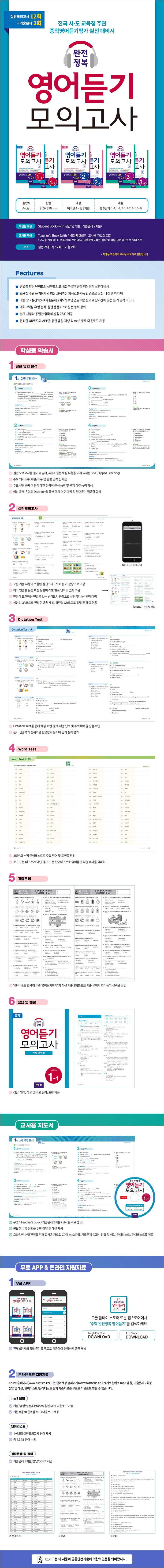 전국 시.도 교육청 주관 중학영어듣기평가 실전 대비 교재. 만점에 도전하는 변별력 있는 난이도의 실전모의고사이다. 매회 '핵심 유형 분석.실전 응용'으로 실전 능력을 강화 할 수 있으며, 교과서 의사소통기능 반영으로 실전.내신을 대비 할 수 있다.