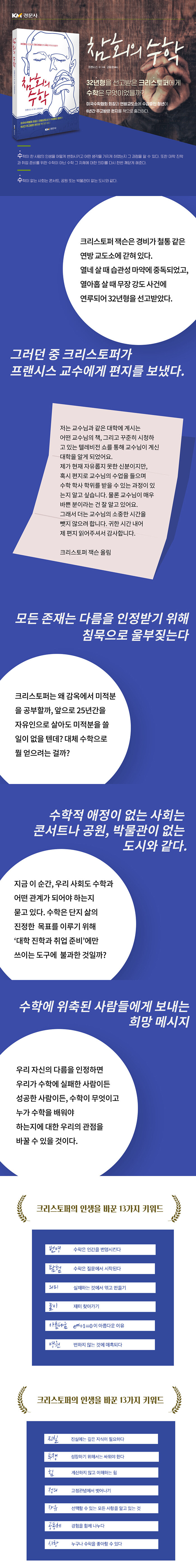 크리스토퍼는 왜 감옥에서 미적분을 공부할까, 앞으로 25년간을 자유인으로 살아도 미적분을 쓸 일이 없을 텐데? 대체 수학으로 뭘 얻으려는 걸까? 시몬은 왜 초월적인 수학적 진리에 사로잡혔을까? 그 진리가 제안하는 것은 무엇일까? 뭐가 더 알고 싶어 안달이 났던 걸까? 다른 이들이 은근히 때로는 노골적으로 당신을 평가해도 왜 꾸준히 수학을 배우거나 수학 탐험가를 고집해야 할까?