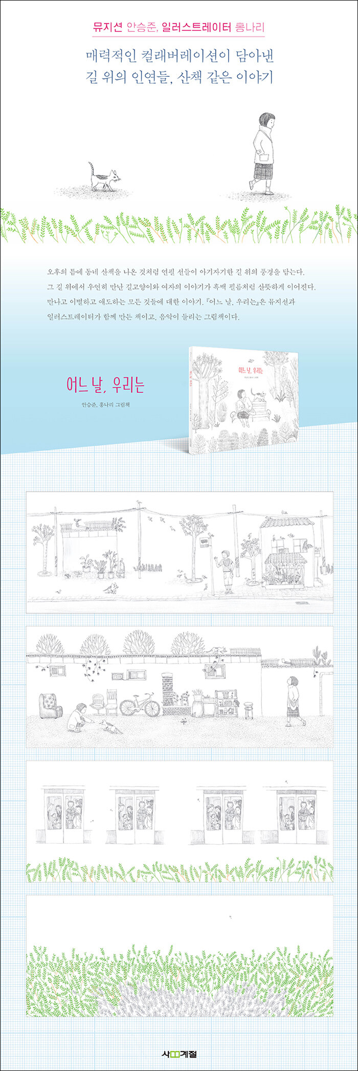 Dear 그림책. 안승준, 홍나리 그림책. 오후의 틈에 가방 하나 달랑 들고 동네 산책을 나온 것처럼, 이 그림책은 그렇게 시작한다. 책의 전체를 아우르는 연필 선들이 그 가벼움을 한층 살리면서 아기자기한 길 위의 풍경들을 담는다.