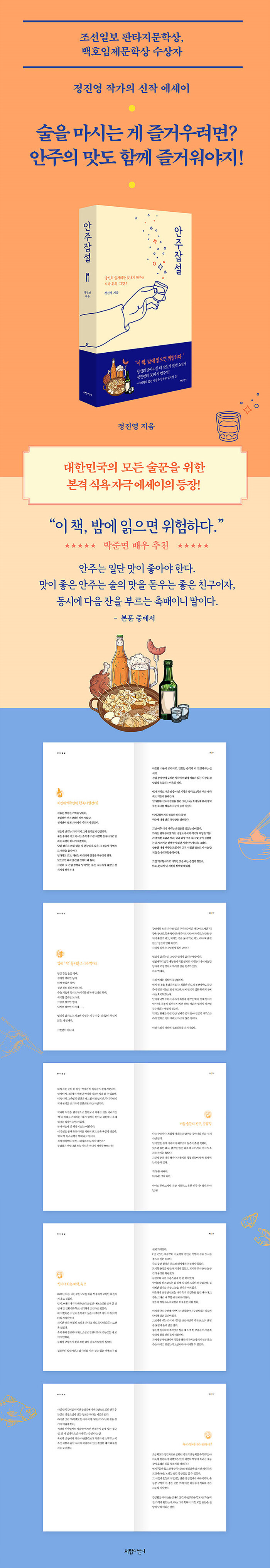 JTBC에서 인기리에 방영했던 드라마 ‘허쉬’의 원작소설 <침묵주의보>의 작가이자 조선일보 판타지문학상과 백호임제문학상을 수상하며 독자들과 문단으로부터 그 폭넓은 필력을 인정받은 소설가 정진영 작가가 이번에는 음식 에세이로 독자들을 찾아왔다. 그것도 무려 안주를 주제로.