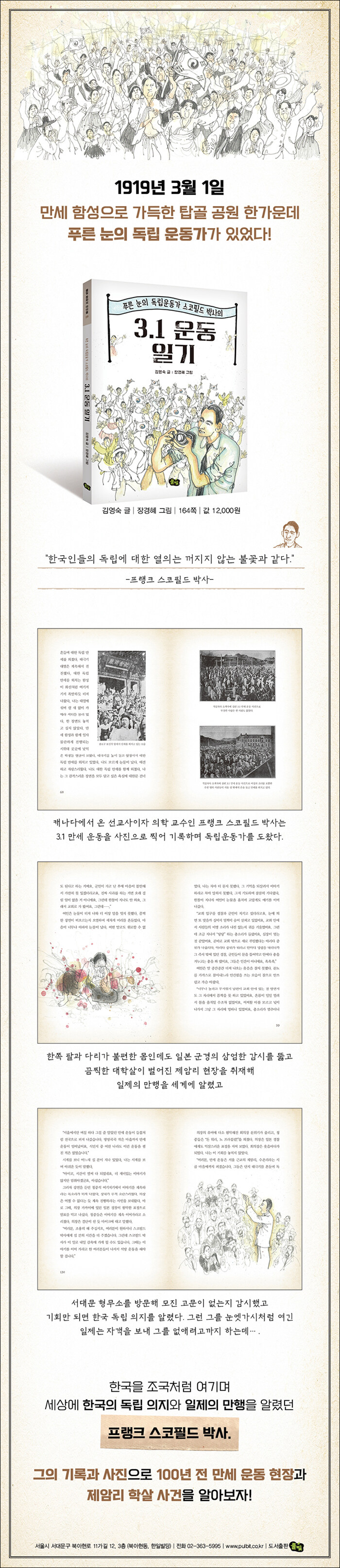 풀빛 동화의 아이들 30권. 푸른 눈의 독립 운동가 프랭크 스코필드 박사가 남긴 기록과 사진, 인터뷰를 바탕으로 3.1 만세 운동이 어떻게 준비되었고 일어났는지, 제암리 학살 사건이 무엇인지 등을 재구성한 일기로 전한다.