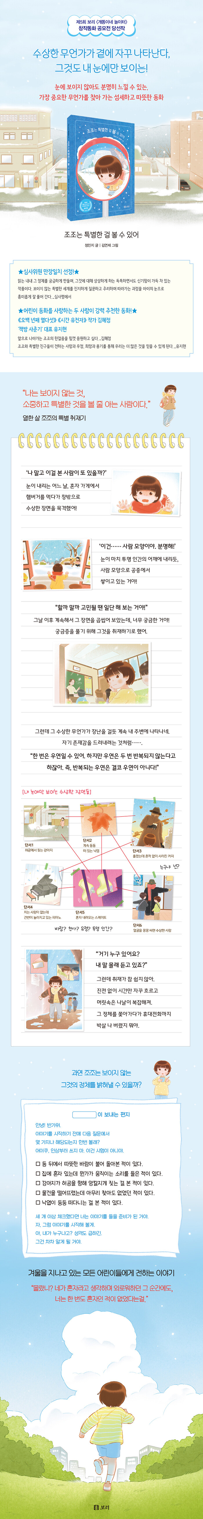 ‘제5회 보리 <개똥이네 놀이터> 창작동화 공모전’ 당선작. 어느 날, 아빠와 아빠의 애인과의 불편한 식사를 마치고 도망치듯 자리를 빠져나온 조조는 홀로 가게에서 햄버거를 먹다가 창밖으로 수상한 장면을 목격하게 된다. 눈이 마치 투명 인간의 어깨에 내리듯, 사람 모양으로 공중에서 쌓이고 있었던 것이다.