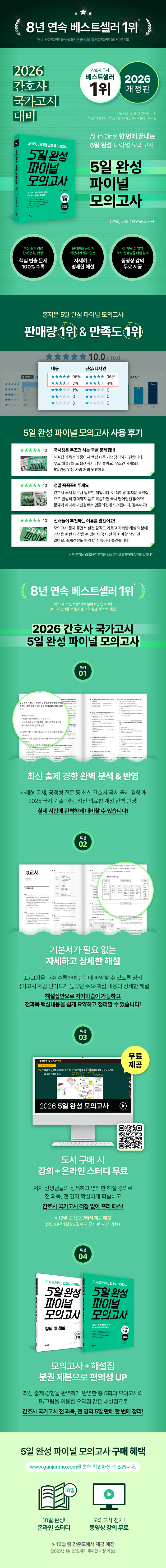 총 5회의 모의고사에 최대한 중복 없이 다양한 개념들을 출제하여 단시간에 국가고시 전 과목, 전 영역의 주요 핵심 내용과 개념들을 빠짐없이 학습할 수 있다.