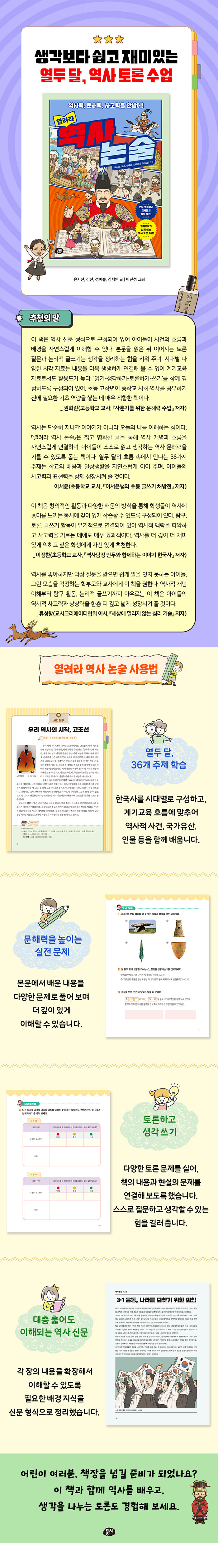 이 책은 스스로 읽고 해석하는 과정 속에서 어휘력과 사고력을 기를 수 있도록 만들었으며, 다양한 질문과 생각 활동을 더해 토론으로 이어질 수 있게 구성했습니다. 단순히 읽는 데서 그치지 않고, 스스로 생각하고 논리적으로 의견을 표현하는 힘, 진짜 문해력과 역사력, 사고력을 키울 수 있도록 했습니다.
