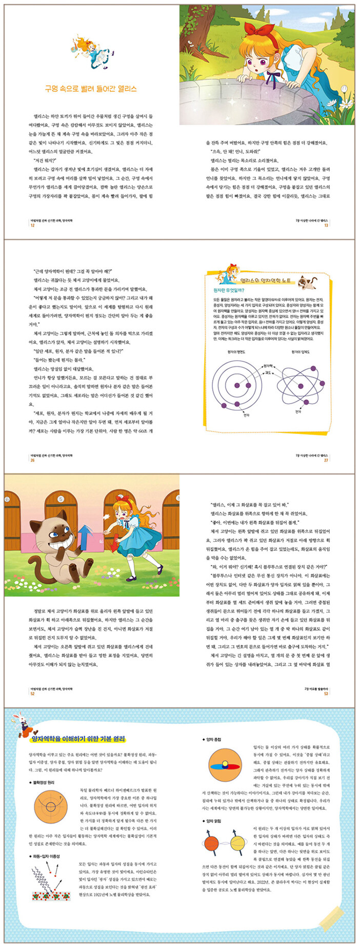 앨리스는 하얀 토끼를 따라가다 우물처럼 생긴 구멍 속으로 떨어집니다. 그런데 그곳은 신비로운 양자역학 세계였지요. 앨리스는 그곳에서 체셔 고양이를 만나 터널링 효과로 벽을 통과하고, 전자 병사들과 마주치며 미시 세계의 규칙을 하나씩 배웁니다. 하지만 원래 세상으로 돌아갈 방법을 찾기 위해 원자핵 여왕을 만나러 갔다가, 외부에서 온 존재라는 이유로 진공 감옥에 끌려갈 위기에 처하고 맙니다. 과연 앨리스는 양자역학 세계에서 탈출해 무사히 집으로 돌아갈 수 있을까요?