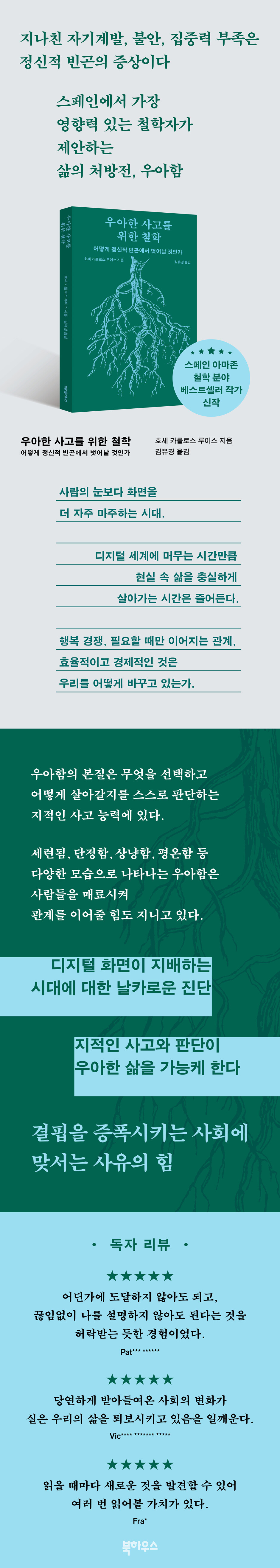 행복은 진정 각자에게 다른 모습일까? 맛집 방문, 해외 여행, 직장 승진 등 작은 성취부터 사회가 마련해야 할 물질적·신체적·심리적 복지까지, 오늘날 행복의 모습은 비슷하다. 인터넷과 소셜네트워크가 일상을 지배하기 전, 행복은 선한 삶을 살다가 운 좋게 주어지는 기분 좋은 일에 불과했다. 그러나 행복은 어느새 도달해야 할 목표가 되었고, 이를 좇는 과정에서 오히려 불안이 커지고 있다. 경쟁하듯 행복을 위해 끊임없이 활동하는 현대인은 마음의 안정을 위해 다시 누군가의 해답과 콘텐츠에 의존한다.