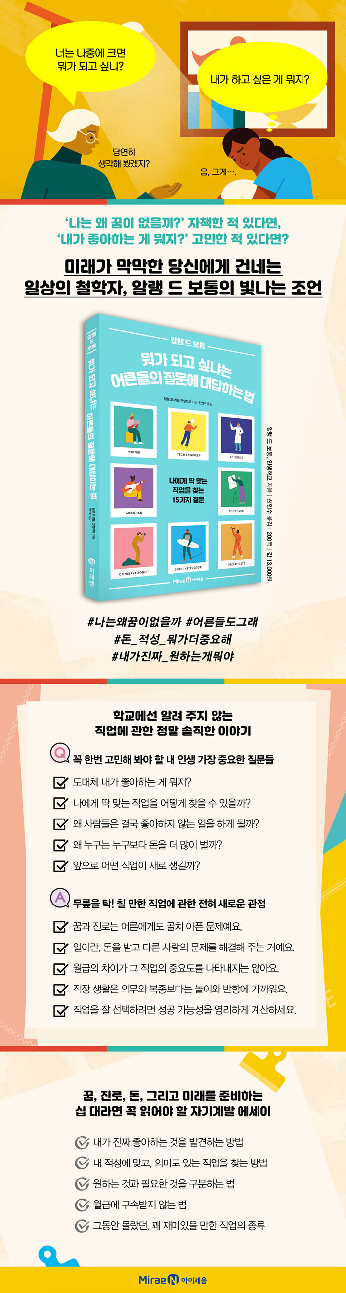 커서 뭐가 될 거냐고 묻는 어른들은 ‘천직’ 같은 답을 기대하는 모양인데, 실제로 천직을 찾는 사람은 정말 드물어요. (…) 나에게 딱 맞는 직업을 못 찾았다는 것이 여러분이 따분하고 시시한 삶을 살 거라는 징조는 아니에요. 그냥 노력해서 앞으로 여러분이 무슨 일을 할지 알아내면 돼요. 이건 지극히 정상적이면서 아주 해 볼 만한 일이지요.