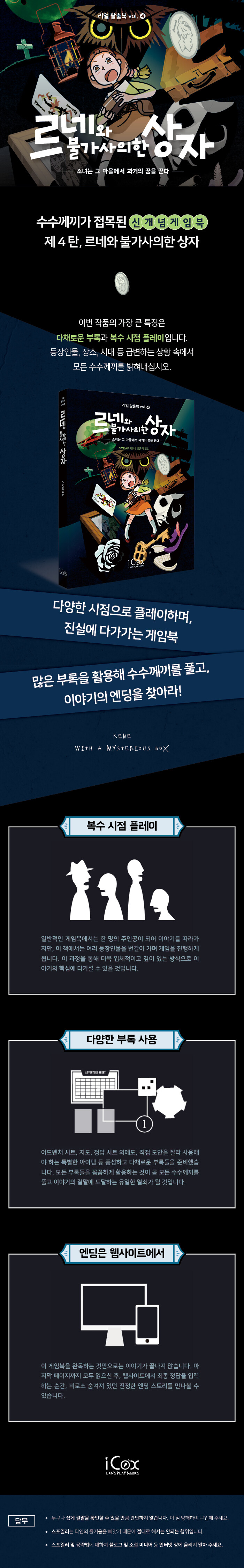리얼 탈출북 시리즈 1탄 ‘늑대인간 마을에서 탈출’이 파티게임 기반의 추리 장르, 2탄 ‘쌍둥이섬에서 탈출’이 판타지&모험 장르, 3탄 ‘10인의 우울한 용의자’가 흥미진진한 미스터리 장르 기반의 탈출북에 이어, 이번 4탄 ‘르네와 불가사의한 상자’는 다채로운 부록과 복수 시점 플레이를 특징으로 합니다.