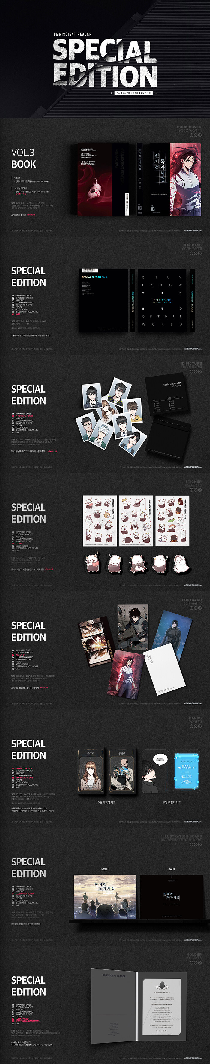 · 제목 : 전지적 독자 시점 3 (스페셜 에디션) (슬립 케이스 1종 + 증명사진 8종(증명사진 봉투 1종) + 엽서 4종 + 일러스트 보드 1종 + 투명 PET 카드 2종 + 투명 스티커 3종 + 굿즈 홀더 1종 + 프리미엄 채널 가입 확인서 1종 + 캐릭터 카드 2종 포함)