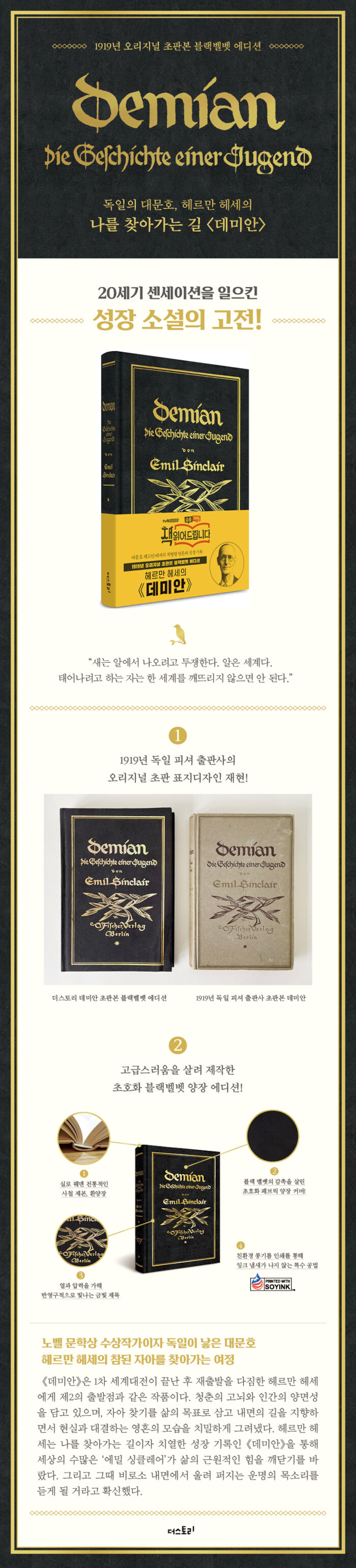 내면의 탐구자이자 자아 성찰의 대표 작가인 헤르만 헤세는 휴머니즘을 지향하며, 고뇌하는 청춘과 자연에 대한 동경, 인간의 양면성 등을 작품에 담았다. 도서출판 더스토리는 헤르만 헤르만 헤세의 대표작인 《데미안》을 초호화 양장 블랙벨벳 에디션으로 제작하였다.