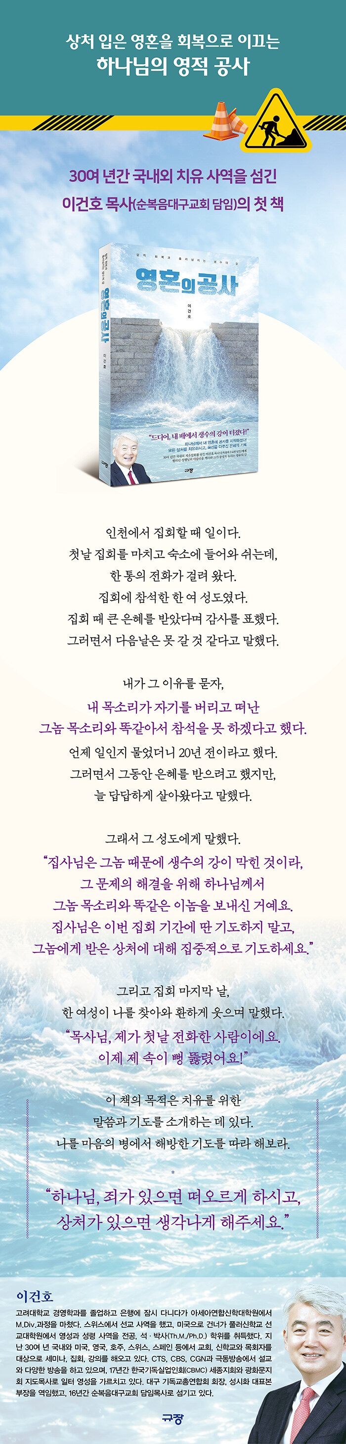 30여 년간 내적 치유 강의와 집회를 해온 이건호 목사(순복음대구교회 담임)의 첫 책으로, 저자는 ‘영혼의 공사’는 단순한 감정적 위로나 일회적인 체험이 아니라고 말한다. 말씀 속 ‘생수의 강’을 삶에서 실제로 경험하길 원하는 이들에게 분명하고도 현실적인 길을 제시한다.