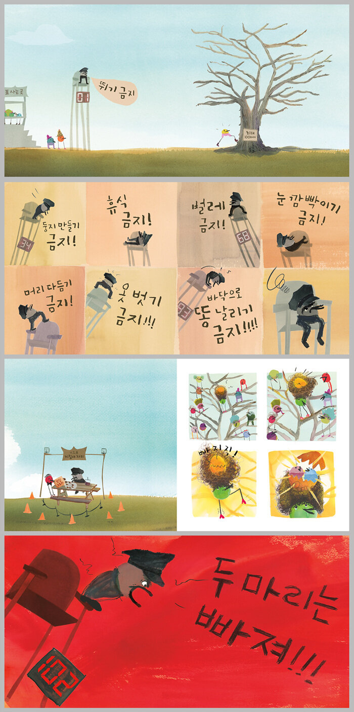 바람그림책 112. 커다란 나무가 있다. 새들은 모두 나무에 오르고 싶어 하지만, 지킴새가 정한 다양한 규칙을 지켜야 한다. 뛰기 금지, 소리 지르기 금지, 휴식 금지, 최대 100마리까지 입장 가능한데….
