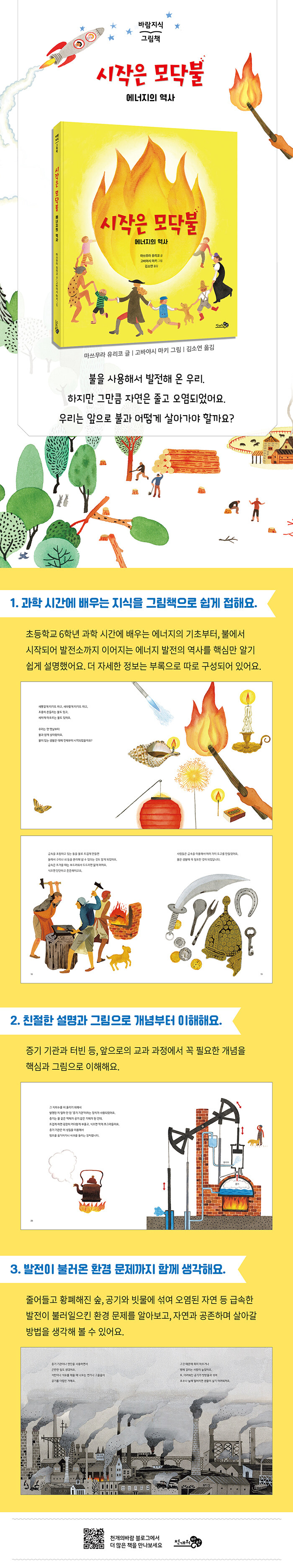 바람지식그림책 1권. 인류는 불을 사용하게 되면서 발전해 왔다. 음식을 익혀 먹고, 그릇을 굽고, 제련 기술을 통해 돌에서 금속을 추출했다. 하지만 인류가 나무를 베고, 화석 연료를 캐며 자연은 황폐해지기 시작했다. 줄어들고 오염된 자연은 인류에게도 큰 영향을 미친다. 이제부터 우리는 불과 에너지와 어떻게 살아가야 할까?
