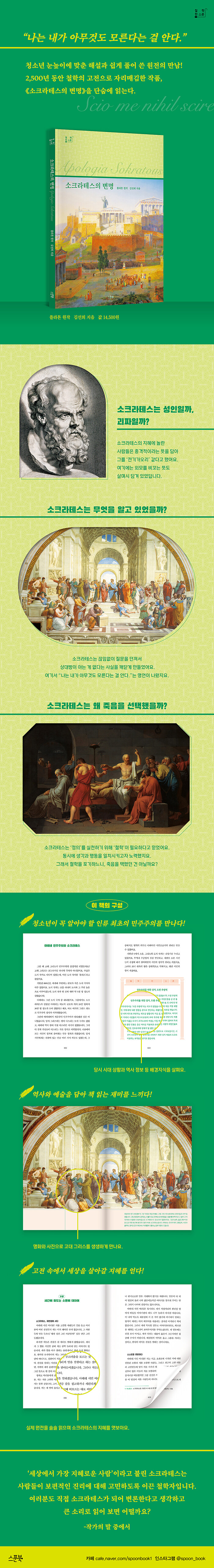 재판정에 선 소크라테스가 스스로 행한 변론을 담고 있다. 그로부터 2,500여 년이 흐른 오늘날, 소크라테스의 일생과 그의 변론에 담긴 철학은 지금까지도 우리에게 깊은 울림을 전한다.