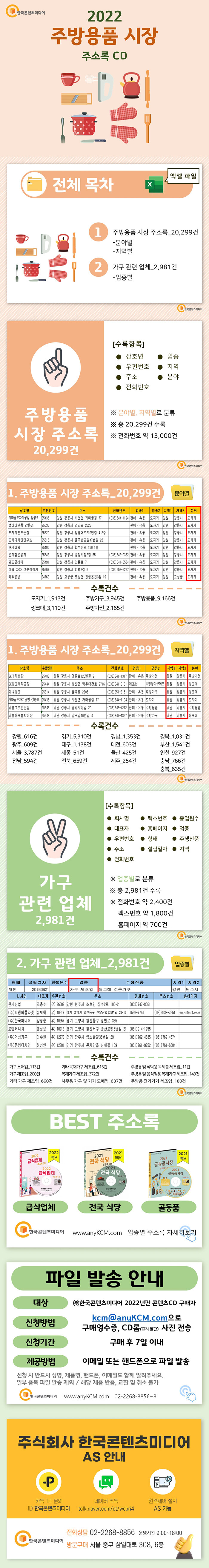 주방용품 시장 주소록을 분야별, 지역별로 20,299건, 가구 관련 업체 주소록을 업종별로 2,981건을 수록했다. 엑셀 파일로 사용자가 편리하게 수정·편집·출력할 수 있다.