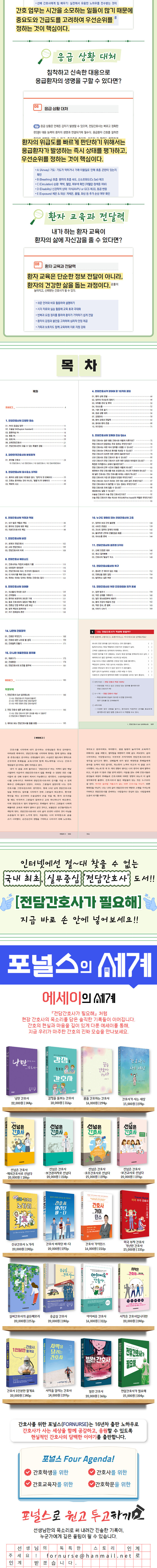 △ 프롤로그 △1. 전담간호사의 다양한 모습 △2. 대한민국간호사의 분류체계 △3. 전담간호사의 필수요소 3가지 △4. 전담간호사가 알아야 할 10가지 꿀팁 △5. 전담간호사의 오해와 진실 Q&A △6. 전담간호사의 역할과 책임 △7. 전담간호사의 비전 △8. 전담간호사 에피소드 △9. 전담간호사의 딜레마 △10. 누구도 말하지 않는 전담간호사의 고충 △11. 전담간호사의 생존법 3가지 △12. 전담간호사로서의 욕구 △13. 전담간호사를 위한 건강관리와 자기 돌봄 △14. 나만의 간호철학 △15. 더 나은 의료현장을 꿈꾸며 △에필로그 △특별부록