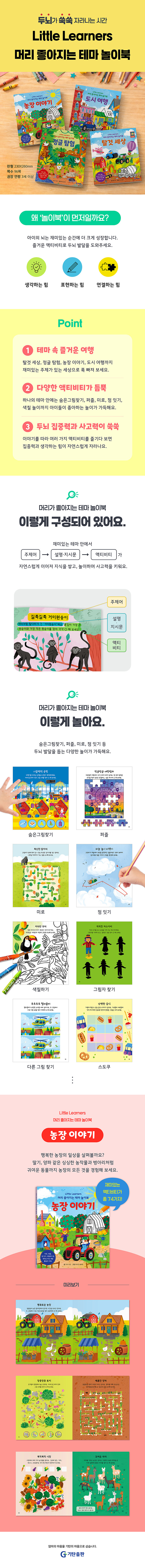 놀이에 가장 몰입할 때 아이의 두뇌는 자연스럽게 성장한다. 좋아하는 주제를 중심으로 숨은그림찾기, 미로, 퍼즐, 점 잇기, 색칠하기 등 다양한 활동을 구성해 흥미와 집중력을 동시에 끌어올린다. 탈것·정글·농장·도시 등 아이들이 꼭 경험해야 할 테마로 구성된 액티비티북 시리즈다.
