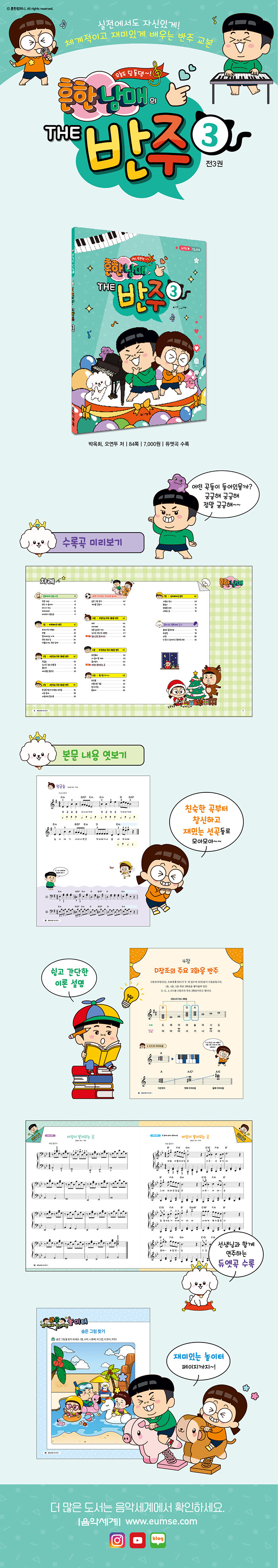 쉽고 간단한 이론 설명과 연습곡마다 반주 패턴을 노출시켜 손쉽게 곡에 적용할 수 있다. 각 음계를 중심으로 기본적으로 사용하는 코드를 체계적으로 익히며 다양한 반주 패턴을 연습할 수 있으며 재미있는 놀이터 페이지와 선생님과 함께 연주할 수 있는 포핸즈 곡이 수록되어 활용도를 높였다.
