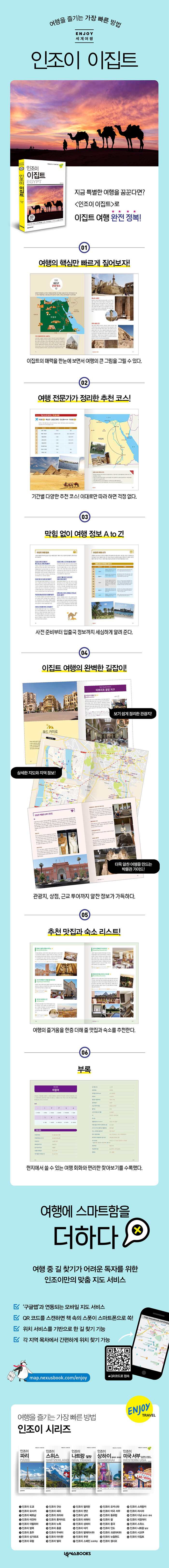 이집트 각 지역의 대표 관광지부터 현지인과 관광객이 모두 사랑하는 맛집과 카페, 편안한 휴식을 제공하는 숙소, 기념품으로 사야 할 쇼핑 아이템까지 빠짐없이 소개하고 있다. 이집트 유물 및 역사 이야기와 현지 팁이 곳곳에 숨어 있어 이집트 여행의 깊이를 더해 준다.