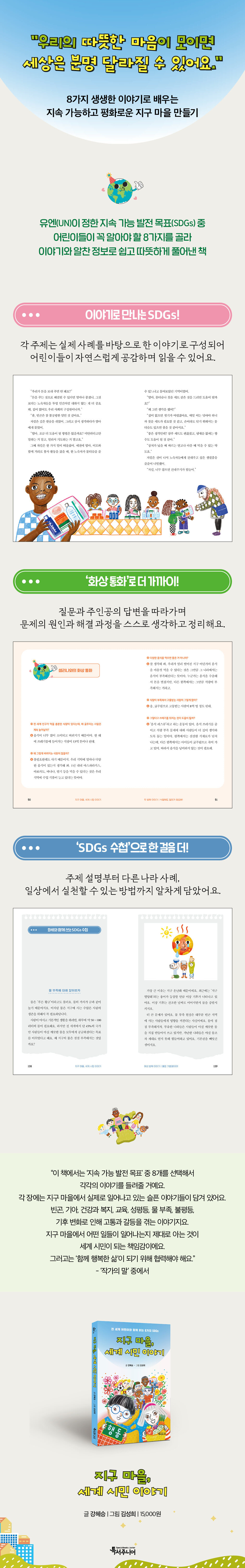 ㈜특별한서재의 아동 브랜드인 ㈜특서주니어에서 기획한 ‘특서 어린이 인문교양’ 시리즈의 여덟 번째 도서 『지구 마을, 세계 시민 이야기』가 출간되었다. 이 책에는 빈곤, 기아, 건강과 복지, 교육, 성평등, 물 부족, 불평등, 기후 변화 등 전 세계가 함께 해결해야 할 8가지 SDGs(지속 가능 발전 목표)를 바탕으로, 세계 곳곳에서 살아가는 어린이들의 이야기가 생생하고 따뜻하게 담겨 있다.