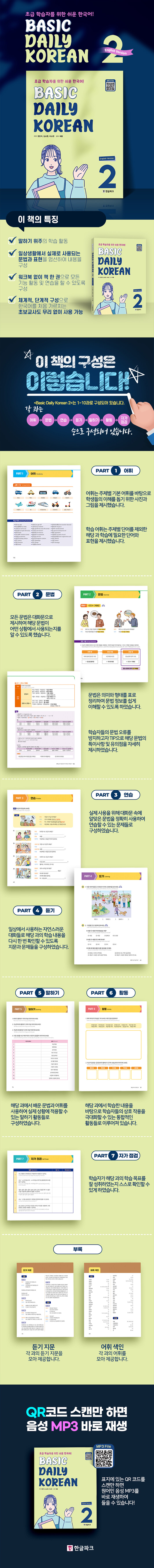 현재 대학의 한국어 교육 실정을 충분히 반영한 초급 단계의 외국인 학부생, 교환 학생, 대학원생을 대상으로 한 통합형 한국어 교재이다. <Basic Daily Korean 1>의 다음 단계의 교재로, 실생활에서 접할 수 있는 상황에 맞는 대화문과 활동으로 이루어져 있으며 학습자들이 재미있고 즐겁게 학습 내용과 활동을 수행할 수 있도록 구성되어 있다.