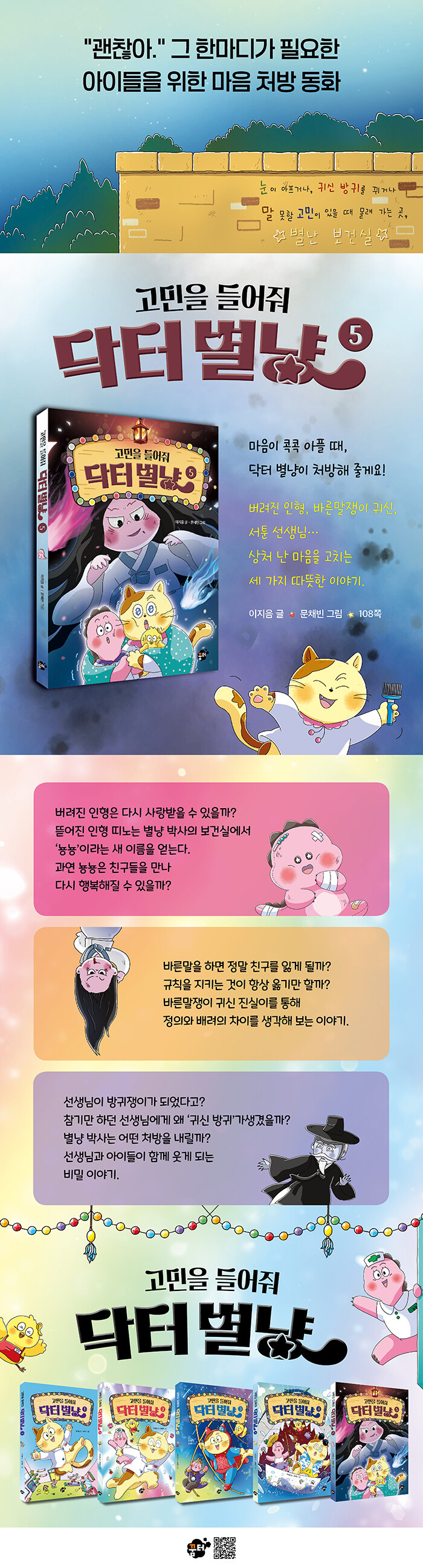 <고민을 들어줘 – 닥터 별냥> 시리즈는 어린이들이 일상에서 마주하는 크고 작은 고민을 판타지적 상상력으로 풀어내며, 마음을 돌보는 방법을 자연스럽게 전해 온 연작 동화입니다. 별난 보건실에 들어서는 순간, 고민은 숨겨야 할 문제가 아니라 함께 나눌 수 있는 이야기가 됩니다.