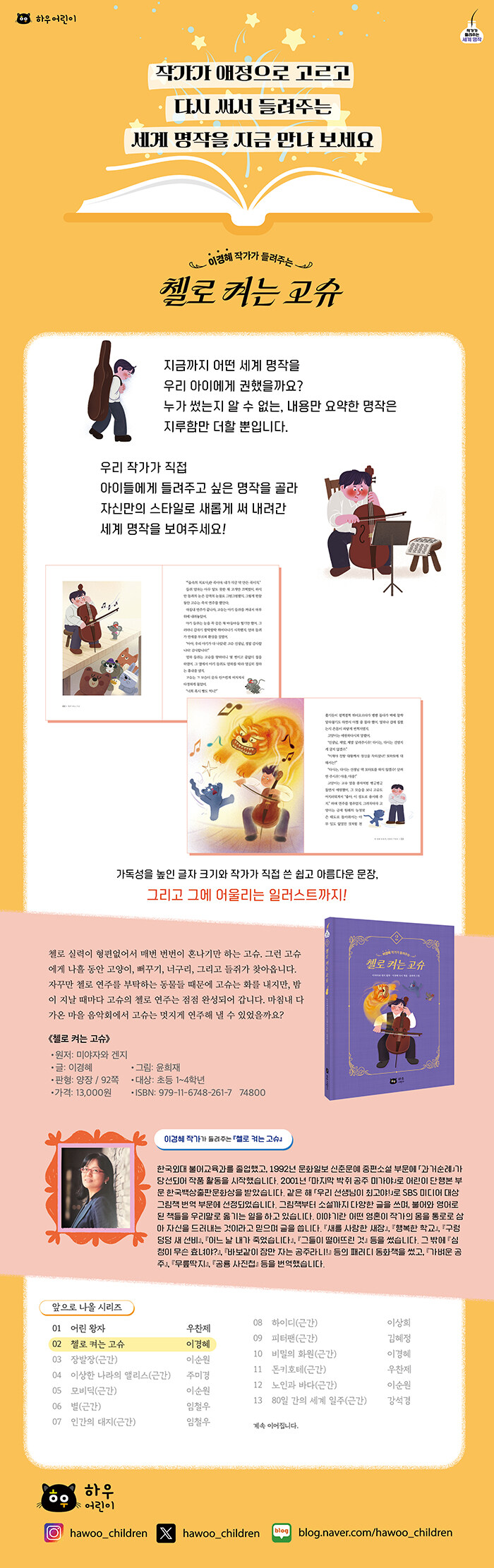이경혜 작가가 들려주는 『첼로 켜는 고슈』. 첼로 실력이 형편 없어서 매번 번번이 혼나기만 하는 고슈. 그런 고슈에게 4일 동안 고양이, 뻐꾸기, 너구리, 그리고 들쥐가 찾아온다. 자꾸만 첼로 연주를 부탁하는 동물들 때문에 고슈는 화를 내지만, 밤이 지날 때마다 고슈의 첼로 연주는 점점 완성되어 간다. 마침내 다가온 마을 음악회에서 고슈는 멋지게 연주를 해 낼 수 있었을까?