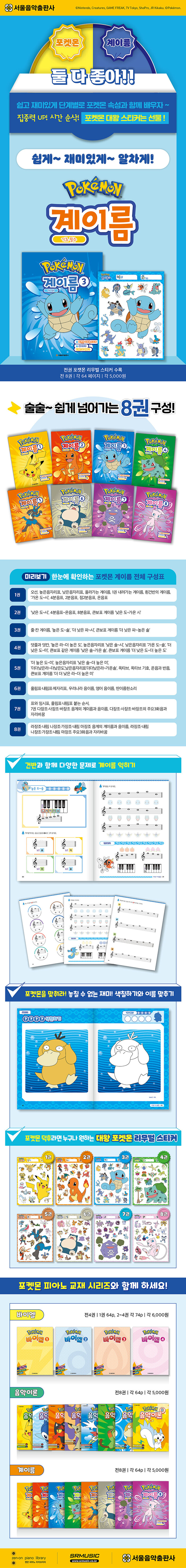 피아노 악보를 보다 쉽게 읽을 수 있도록 건반과 함께 다양한 문제로 계이름을 배워나갈 수 있도록 한 교재다. 속성별 인기 포켓몬들이 매 권마다 바뀌어 흥미를 높였고, 포켓몬 이름을 맞히고 색칠도 하는 쉬어가기를 수록하여 신나게 할 수 있다.