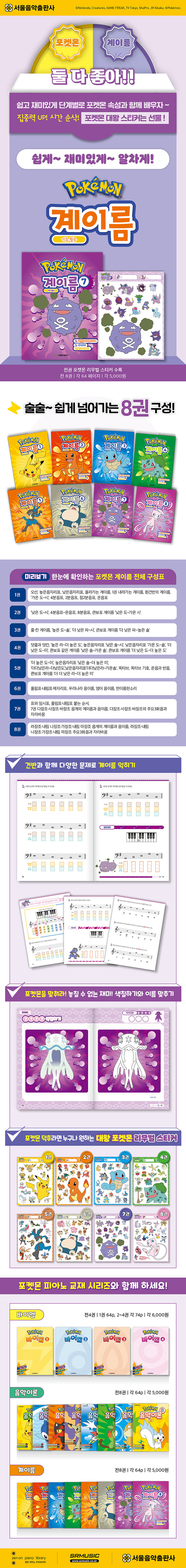 인기 캐릭터 포켓몬스터와 함께하는 기초 필수 계이름 공부로 1권부터 8권까지 전 8권 구성이다. 피아노 악보를 보다 쉽게 읽을 수 있도록 건반과 함께 다양한 문제로 계이름을 배워나갈 수 있도록 한 교재다. 속성별 인기 포켓몬들이 매 권마다 바뀌어 흥미를 높였고, 포켓몬 이름을 맞히고 색칠도 하는 쉬어가기를 수록하여 신나게 할 수 있다.