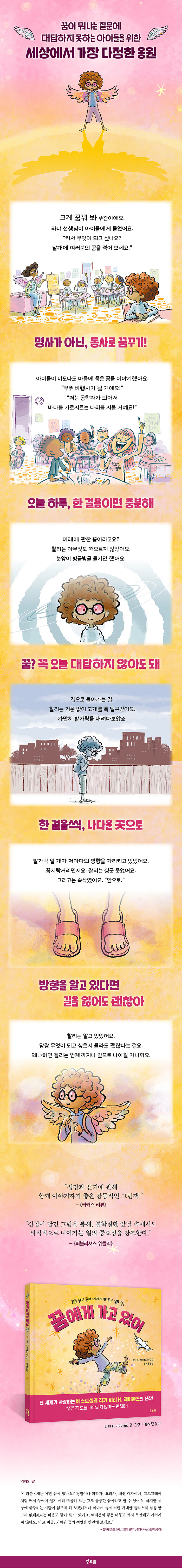 언제나 아이들을 향해 격려와 용기의 메시지를 전해 온 피터 H. 레이놀즈는 인생에서 커다란 질문에 맞닥뜨렸을 때 답을 알지 못해도 괜찮다고 이야기합니다. 꼼지락거리는 발가락처럼 지금 이 순간에도 나다운 방향으로 조금씩 움직이고 있다면 그것으로도 충분하다고요. 『꿈에게 가고 있어』는 꿈을 직업으로 생각하고 있던 어린이 독자뿐 아니라 먹먹한 마음을 품은 적 있는 모두를 위한 다정하고 단단한 그림책이 되어 줄 것입니다.